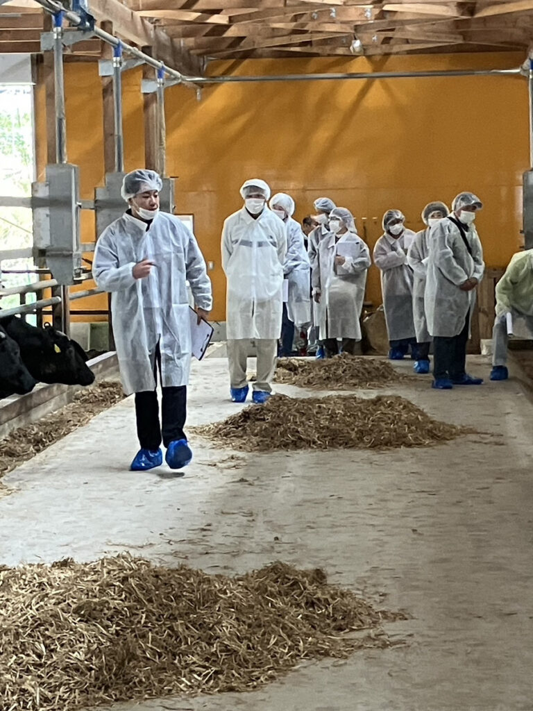 当日は当社社長のほか営業担当者がガイドとなり、『幸生牛』の特徴と地元農家さんから提供していただく籾殻・稲藁を寝床や餌に使い、牛の排せつ物を発酵させてつくる有機堆肥を農家さんへお渡しする「循環型農業システム」について説明。牛たちがストレスなく成長するための環境づくりや飼料へのこだわり、牛舎の衛生管理について常に最善の取り組みを行なっていることを伝えました。牛たちの一番近くで、日々お世話をしているドリームファームのスタッフにも参加者から質問が寄せられていました。