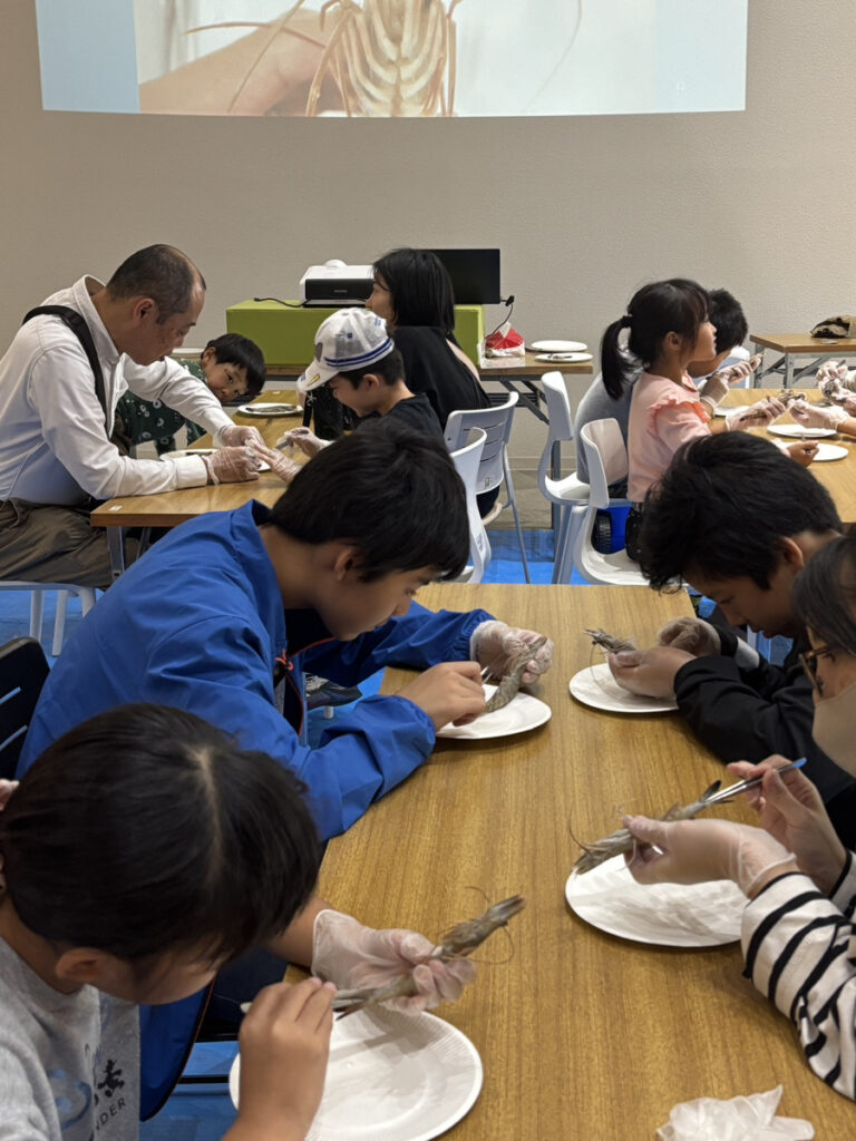 参加者の小中学生たちは、初めて知るエビの構造や機能、生態を知り、好奇心に没頭するように解剖をしていました。